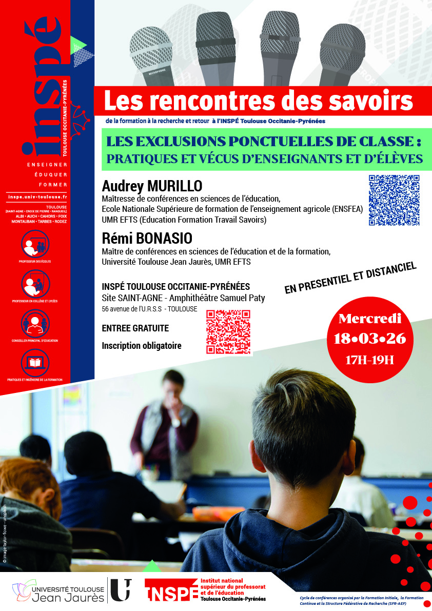 Dans le cadre du cycle de conférences "Les rencontres des savoirs" organisé par la Formation Initiale, la Formation Continue et la Structure Fédérative de Recherche (SFR-AEF) de l’INSPÉ Toulouse Occitanie-Pyrénées.